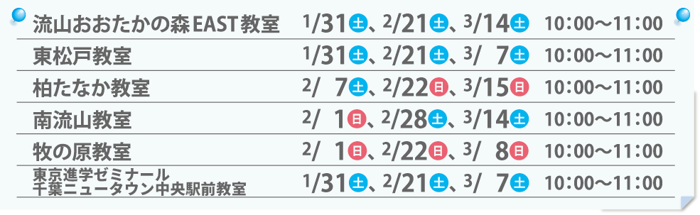 | 流山おおたかの森 EAST 教室 | 15:30〜16:20 | 15:30〜16:20 | 15:30〜16:20 | 13:00〜13:50 | |