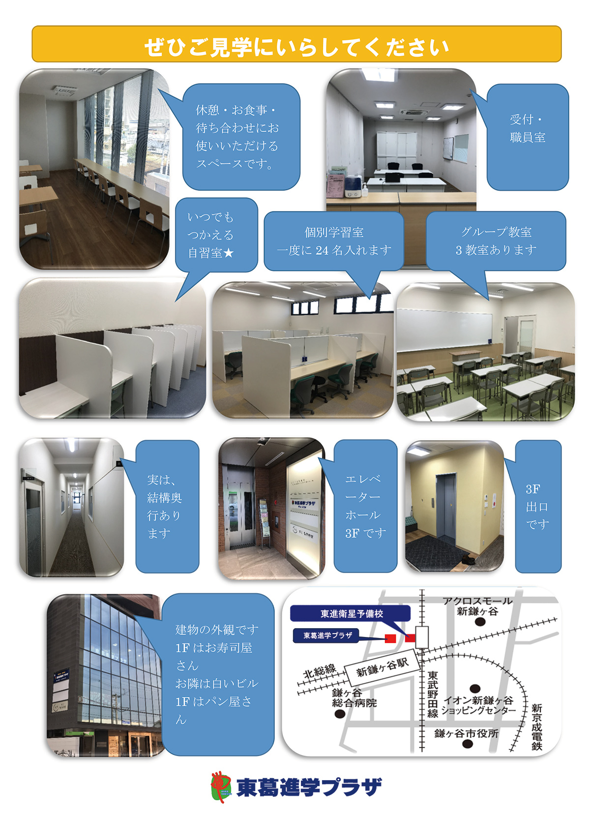 また、入退室通知システムや、ご送迎の際に待ち合わせ場所としても使えるリフレッシュルーム、駅から徒歩30秒の好立地など、環境面・安全面も万全です。