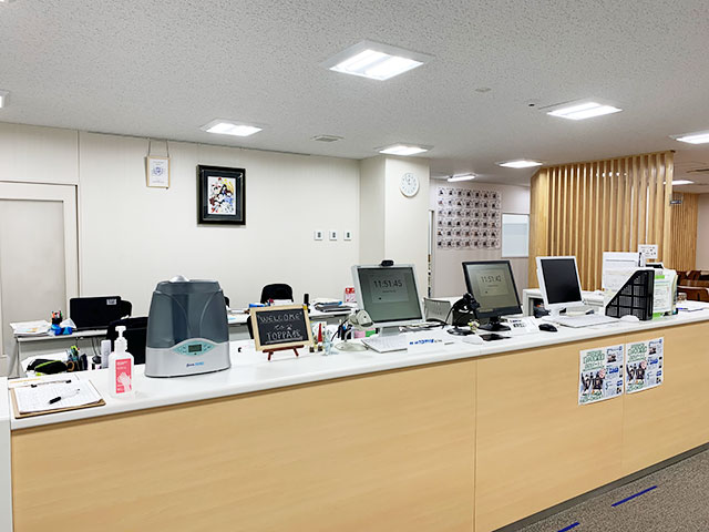 開放感のある受付でお子様をお出迎えします。お子様が入室・退室を行うと保護者様にご連絡がいく入退室管理システムを導入しており、通塾もご安心いただけます。