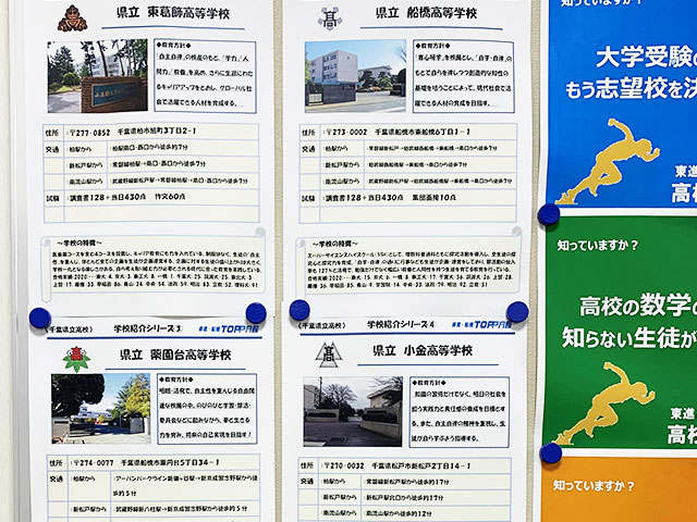 高校の情報を掲示しています。休み時間や帰りのタイミングなどで確認をすることが出来ます。受験生になる前から高校を考えることで、トップ校を目指す意識を持っていただきます。