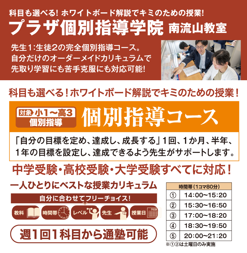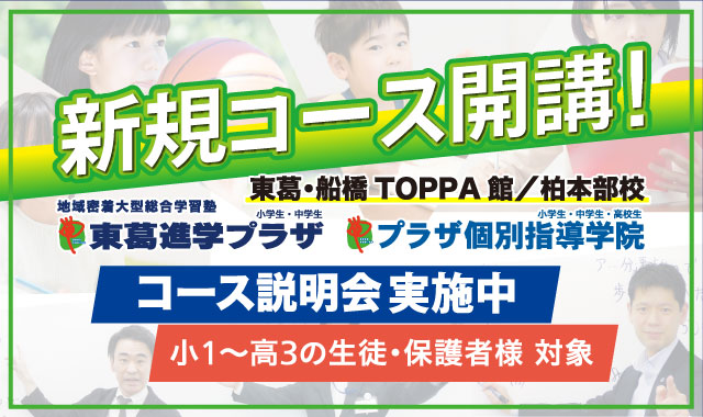小中高一貫指導を掲げ、東葛進学プラザ・プラザ個別指導学院・東進衛星予備校を展開する進学プラザグループ南流山教室は、充実の学習環境と多彩な学びで一人ひとりの志望校合格を応援します。