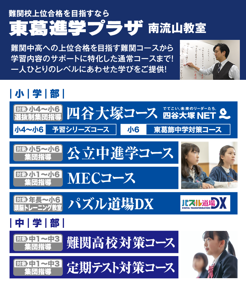 東葛飾中学をはじめ東京の難関私立中学、東葛飾高校、何冠大学現役合格を目指す子どもたちを全力でサポートします。